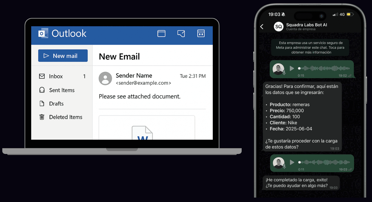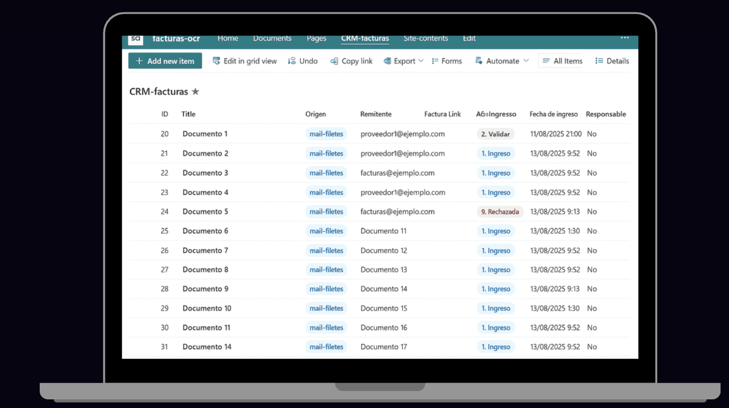 La factura llega por email y la IA analiza adjuntos (PDF, imagen, texto), extrayendo número, fecha, CUIT, proveedor, ítems y montos.